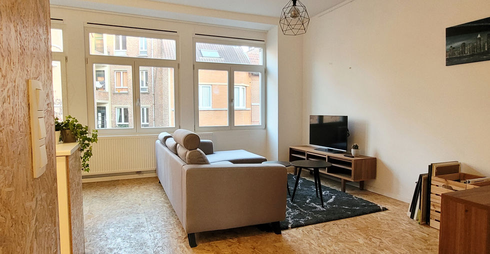 PARC DUDEN – Dans une petite copropriété avec jardin commun rénovée à neuf en 2021. Magnifique appartement 1 chambre (non meublé) d’environ 55m². Il se compose comme suit : hall d’entrée, living (±27m²) avec cuisine américaine super équipée (frigo, congélateur, four, taques de cuisson électriques, lave-vaisselle, double évier, hotte, rangements), une belle chambre (±14m²), un dressing, une salle de douche avec WC. Au sous-sol une cave privative avec conexion pour machine à laver et deux grandes caves communes. A proximité de toutes les facilités. Transport en commun : Tram (82, 97) – Train (midi) – Bus (48, 50, 52, 54, 74). Provisions pour charges communes : 65€ incluant la consommation d’eau froide privative, le nettoyage des parties communes, l’électricité des communs, l’abandon de recours, …). PEB E : 237 kWhEP/m²/an. Visites et renseignements complémentaires : +32 472.74.50.36. IPI 512.161.